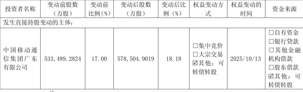 10月13日,浦发银行发布公告,收到中国移动通知,其于当日将所持的5631万张浦发转债按每股12.51元转为普通股4.5亿股,耗资56亿。