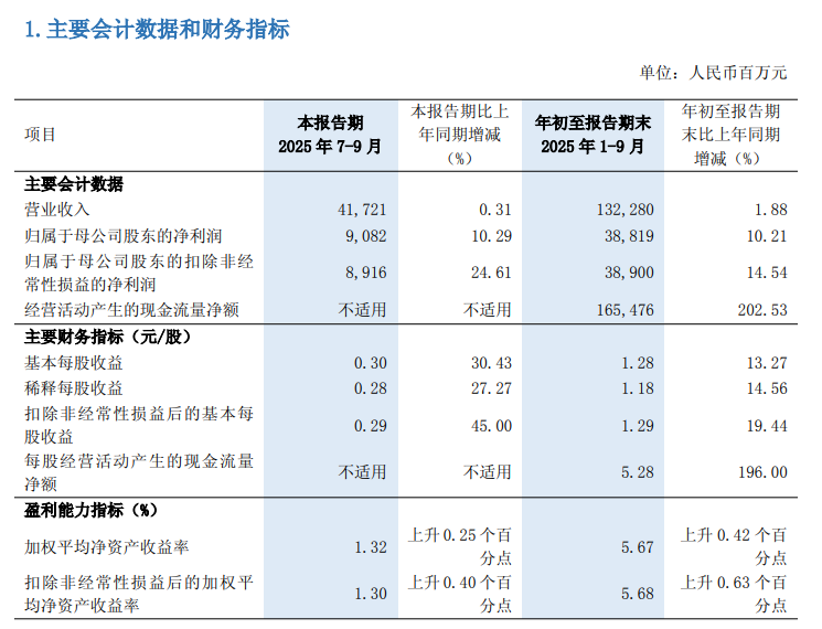 2025年前三季度,该行实现营业收入1322.80亿元,同比增长1.88%;一改2021年至2024年连续4年营收同比下滑态势;归属于母公司股东的净利润388.19亿元,同比增幅高达10.21%,增速较上半年进一步加快,盈利能力持续增强。