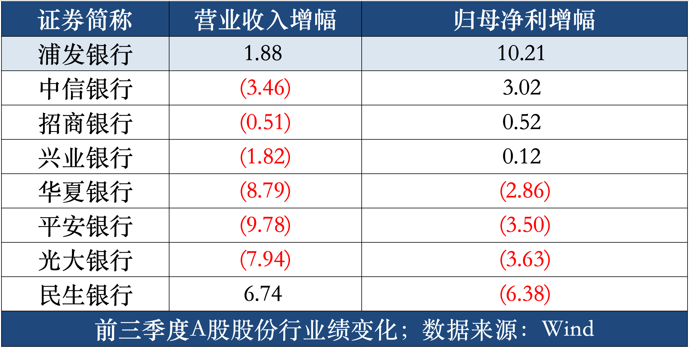 前三季度, 浦发银行 共录得营收、归母净利1322.80亿元、35.96亿元,同比增幅分别为1.88%、10.21%;