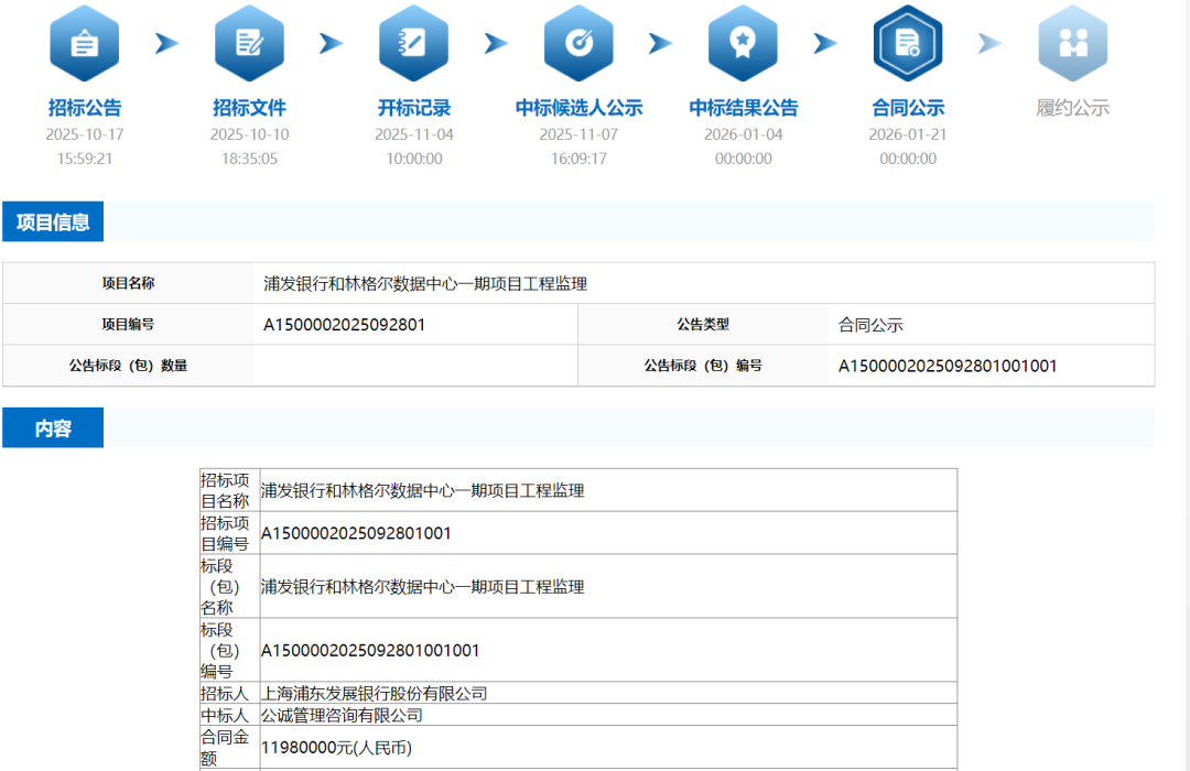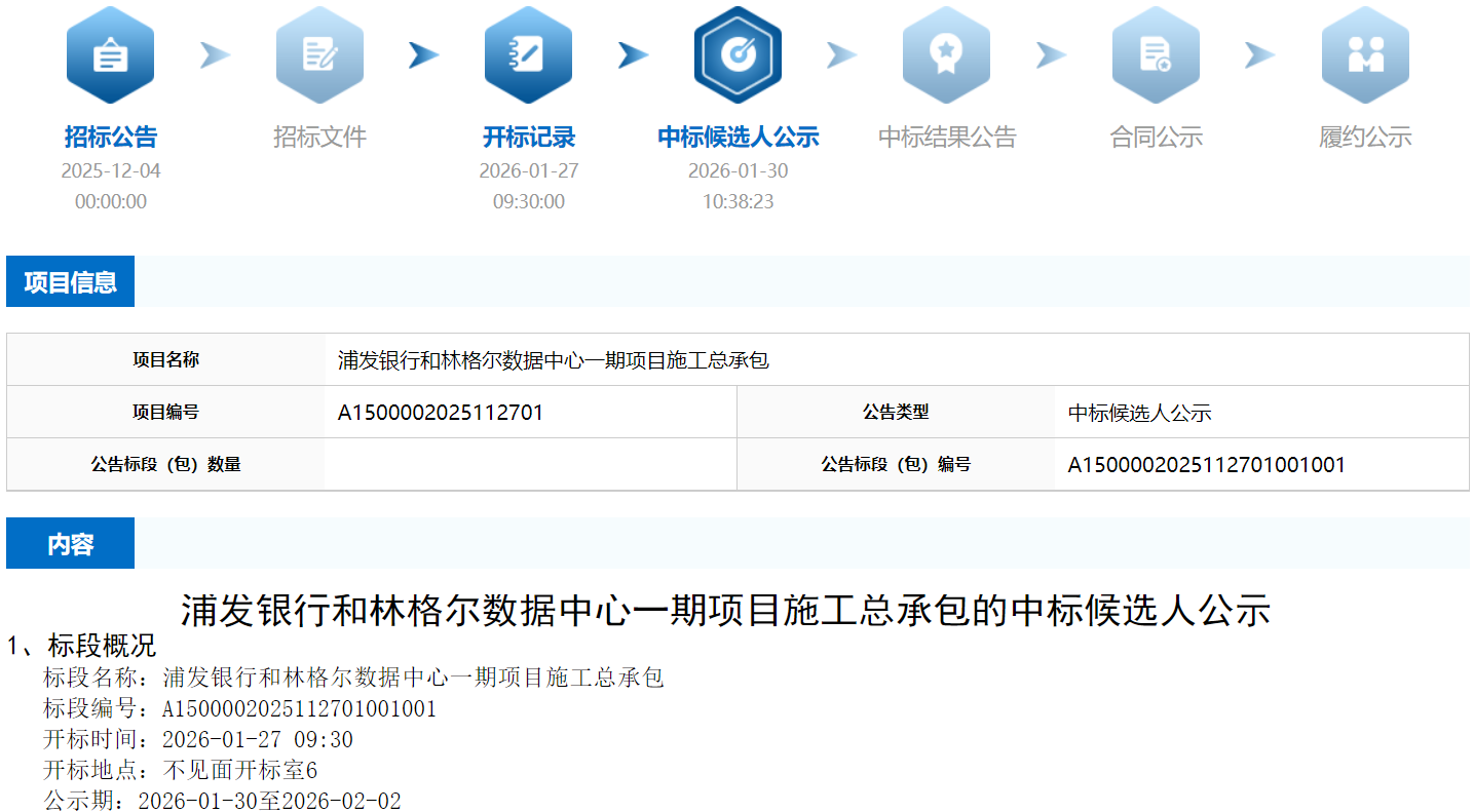 2026年1月30日,上海浦东发展银行股份有限公司《浦发银行和林格尔数据中心一期项目施工总承包》中标候选人公示。