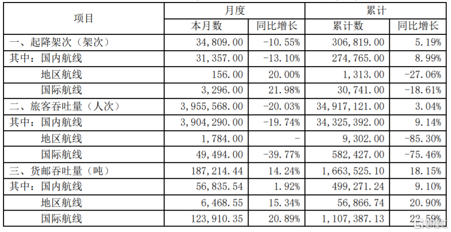 白云机场(600004.SH)发布2021年10月生产经营数据快报,起降3.48万架次,同比下降10.55%;旅客吞吐量395.56万人次,同比下降20.03%;货邮吞吐量18.72万吨,同比增长14.24%。