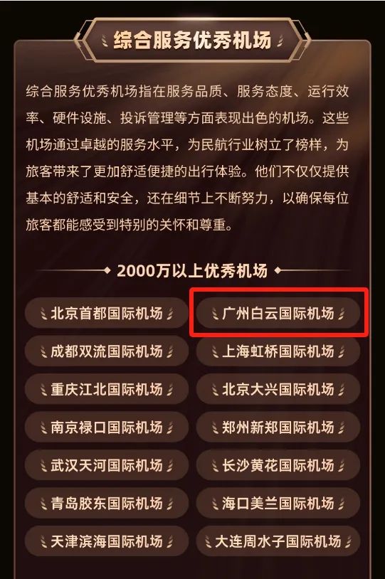 综合服务优秀机场指在服务品质、服务态度、运行效率、硬件设施、投诉管理等方面表现出色的机场。这些机场通过卓越的服务水平,为民航行业树立了榜样,为旅客带来了更加舒适便捷的出行体验,在提供基本的舒适和安全基础上,还在细节上不断努力,以确保每位旅客都能感受到特别的关怀和尊重。