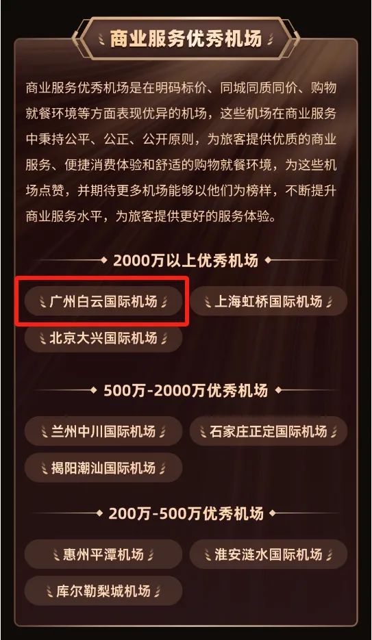 近日,民航局消费者事务中心发布《2023年民航旅客满意指数》,白云机场获评“2000万以上综合服务优秀机场”、“商业服务优秀机场”。