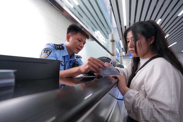 移民管理警察为符合条件的旅客办理240小时过境免签手续(本文图片均由黎锋俊拍摄)
