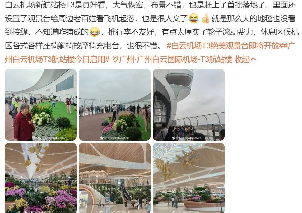 11月3日,广州白云国际机场T3航站楼启用第5天,有部分网友反映T3航站楼内地毯摩擦力较大,导致拉行李困难。