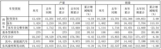 2021年汽车累计生产174002辆,同比下降0.45%;商用车轻型货车累计生产147073辆,同比下降4.04%;客车累计生产16203辆,同比增幅112.97%;客车非完整车辆累计生产10451辆,同比下降23.54%;东风康明斯发动机累计生产213331台,同比下降0.39%