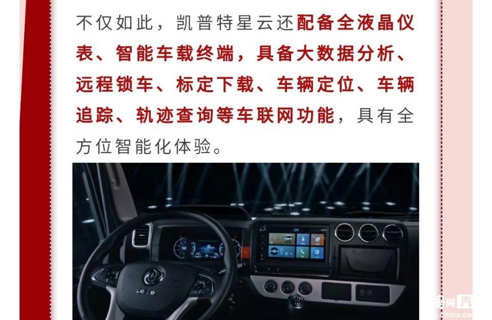 据了解,凯普特星云是东风汽车股份经十年布局,整个研发过程历时三年之久。同时宣传该车搭载了ABS、ESC、LDW、FCW、AEBS等科技配置,综合自动驾驶能力能够追平现阶段L2级驾驶能力。在服务方面,官方还推出了购、用、养、换全生命周期整体解决方案,为凯普特星云客户提供专属服务政策。