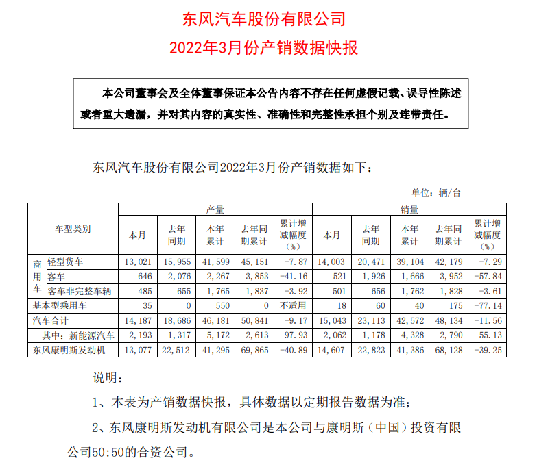 中国网汽车4月13日讯记者日前获悉,东风汽车于近日发布了最新的产销数据,据统计,东风汽车产量合计14187辆,相比去年同期的18686辆,同比下降了24.08%,销量合计15043辆,相比去年同期的23113辆,同比下降了34.92%。今年1-3月,累计产量为46181辆,同比下降9.17%,累计销量为42572辆,同比下降11.56%。