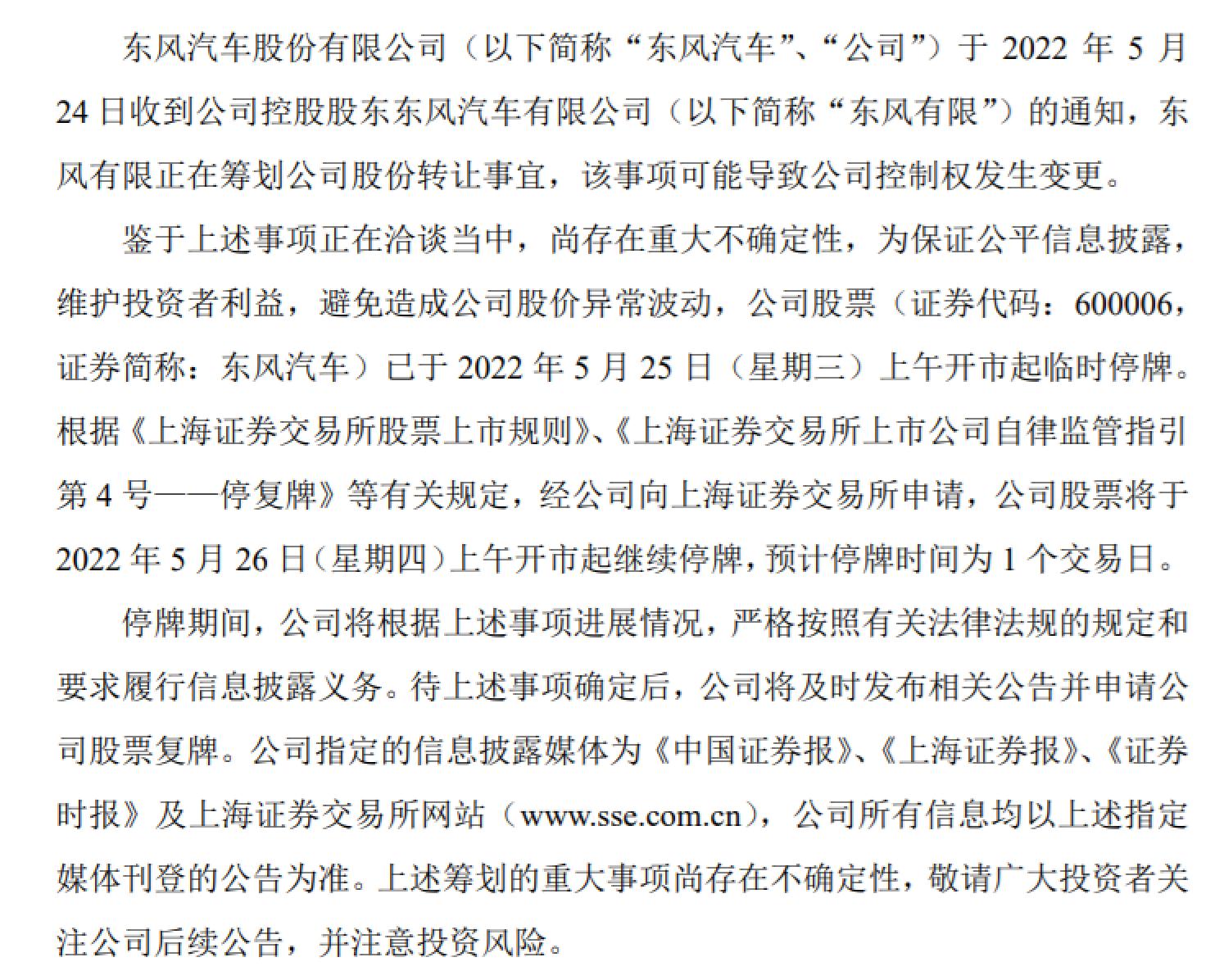 东风汽车表示,上述事项可能导致该公司控制权发生变更。