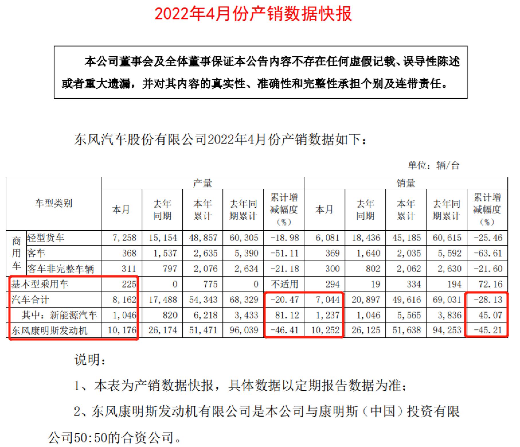 5月9日,东风汽车发布的4月产销数据快报显示,4月份汽车总销量为7044辆,前4个月汽车累计销量为69031辆,累计下降28.13%;4月汽车总产量为8162辆,前4个月汽车累计产量为54343辆,累计下降20.47%。