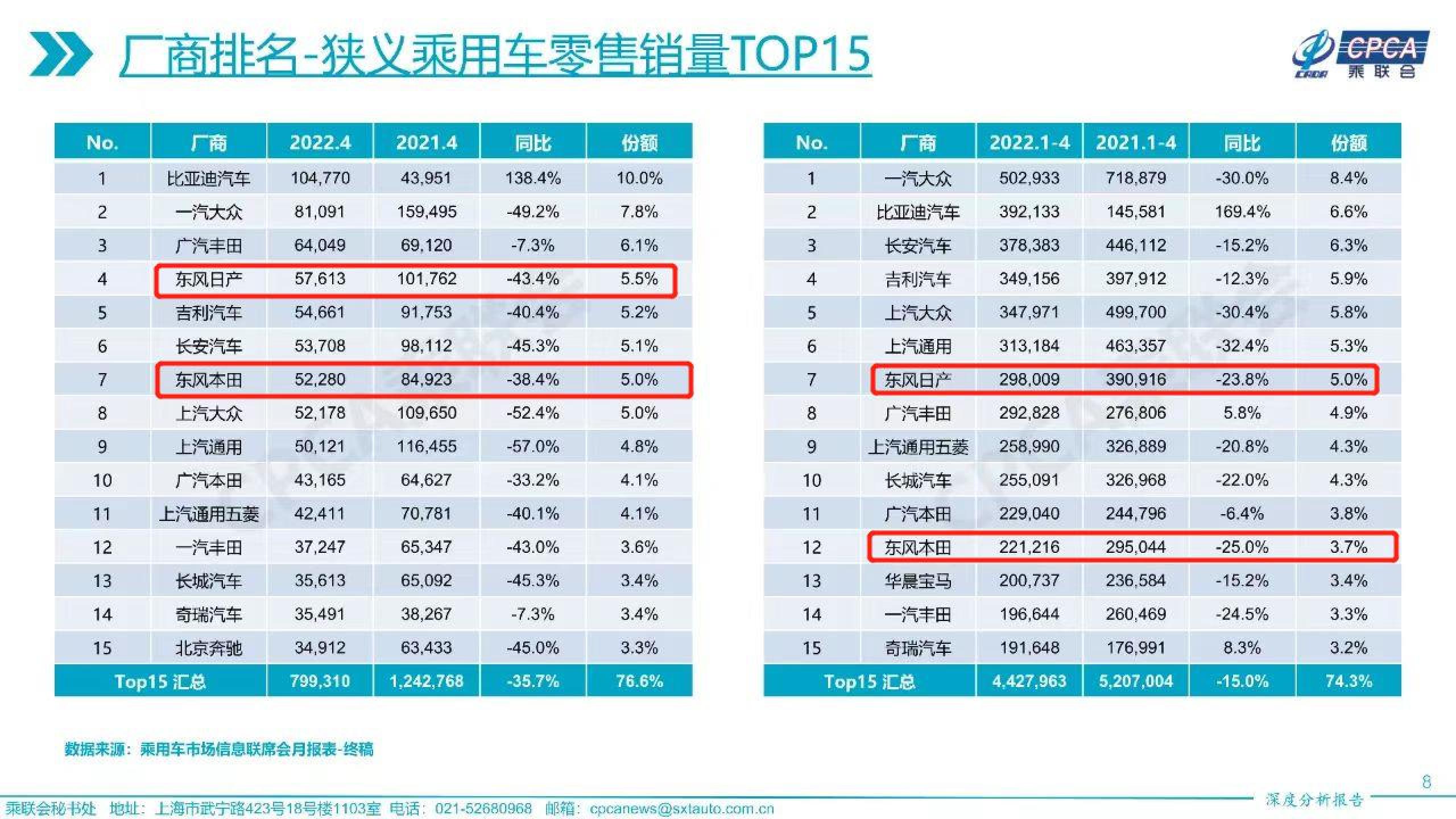 东风日产4月狭义乘用车零售销量为5.76万辆,同比下降43.4%,占市场份额5.5%,狭义乘用车零售销量榜单中排行第4;1-4月累计零售销量为29.80万辆,同比下降23.8%,占市场份额5.0%,排行第7。