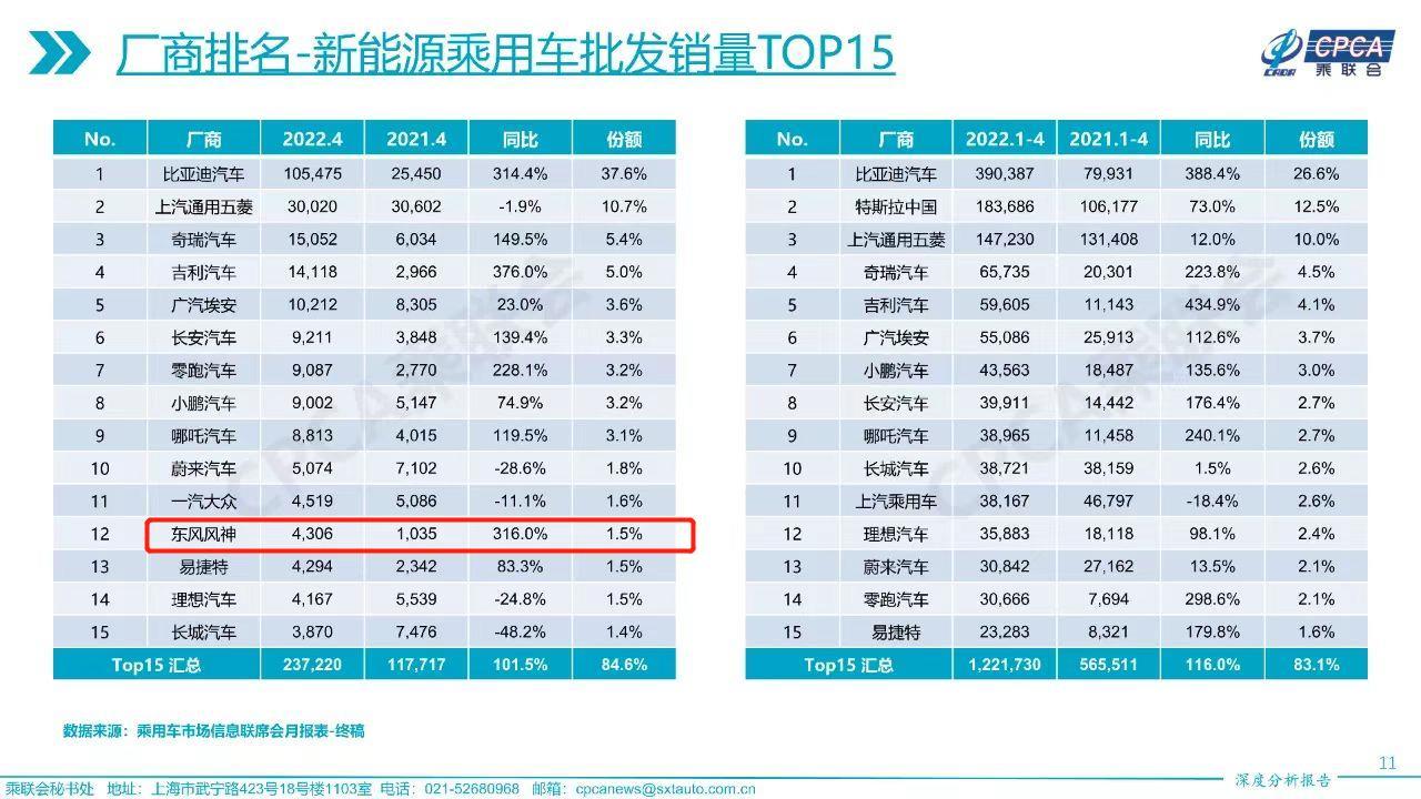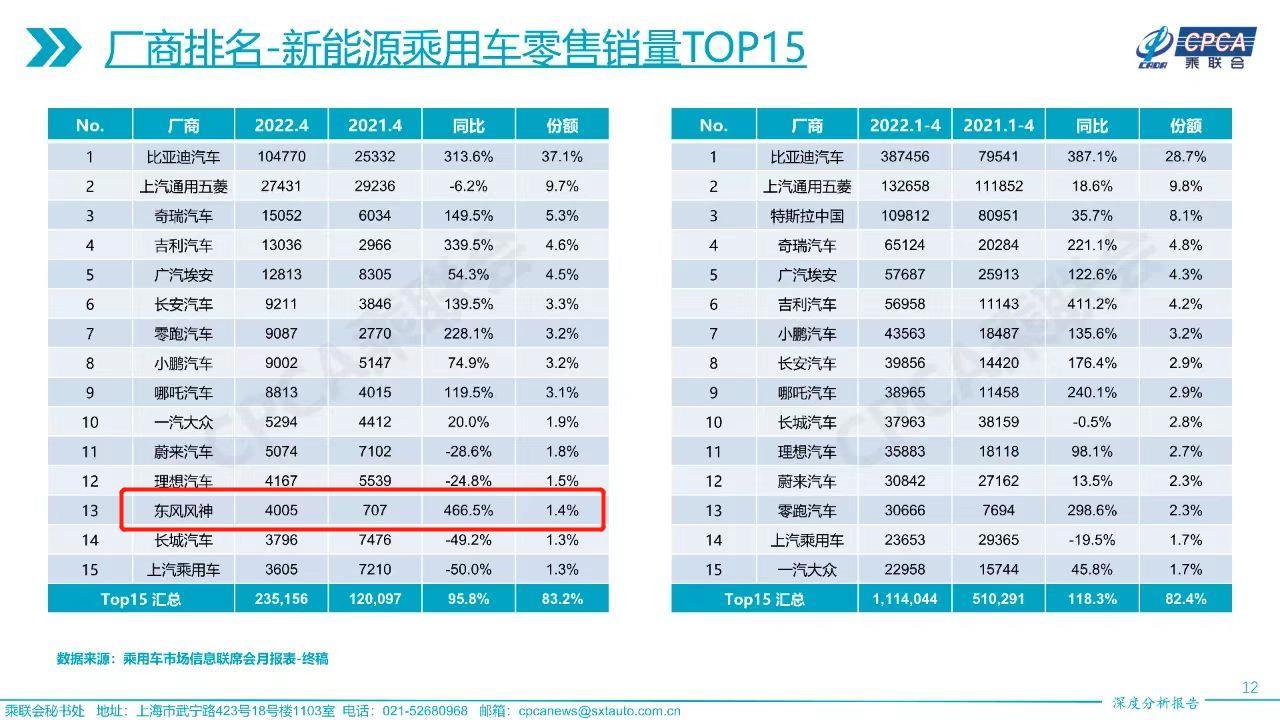 在新能源汽车方面,东风风神4月新能源乘用车批发销量为4306辆,占市场份额的1.5%,4月新能源乘用车批发销量榜单中排行第12;4月新能源乘用车零售销量为4005辆,占市场份额的1.4%,4月新能源乘用车零售销量榜单中排行第13。