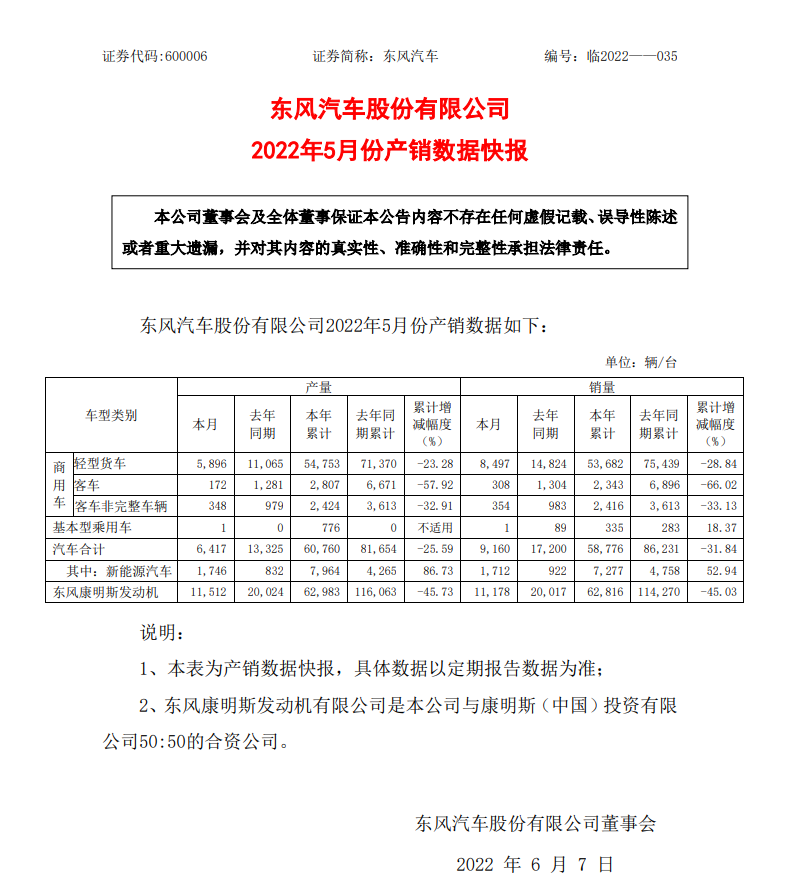中国网汽车6月9日讯记者从官方获悉,东风汽车日前发布了2022年5月份产销数据快报,据统计,东风汽车5月产量为6417辆,同比下滑51.84%。销量为9160辆,同比下滑46.74%。今年1-5月份,累计产量60760辆,同比下滑25.59%;累计销量为58776辆,同比下滑31.84%。