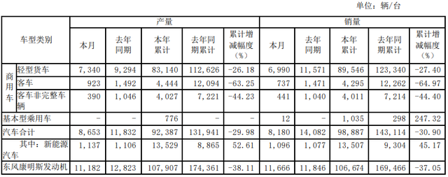 集微网消息,10月11日,东风汽车发布公告称,9月生产汽车8653辆,少于上年同期的1.18万辆,今年累计生产汽车9.24万辆,同比下滑29.98%;销量方面,9月售出8180辆,少于上年同期的1.41万辆,今年累计售出9.89万辆,同比下滑30.9%。