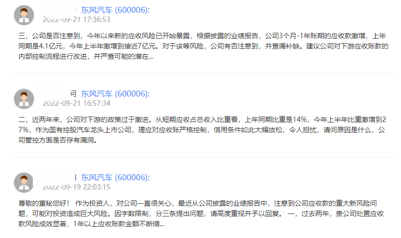 此外,近期在投资者互动平台上,有投资者问及,东风汽车的短期应收账款有激增的现象,是否注意到此事。