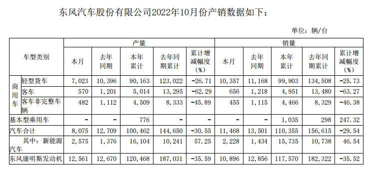 资料显示,东风汽车的主要业务为轻型商用车整车以及动力总成的研发和制造,生产车型涵盖轻型卡车、轻型客车、客车底盘、新能源物流车,产品品牌包括东风凯普特、东风多利卡等,发动机业务包括东风康明斯系列柴油发动机、日产轻型柴油发动机。