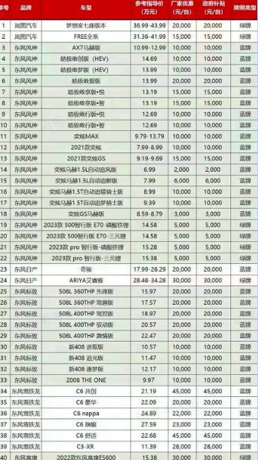 东风岚图、本田、东风标致、东风雪铁龙、东风日产等品牌也有不同幅度降价,优惠力度在1万到9万元不等。