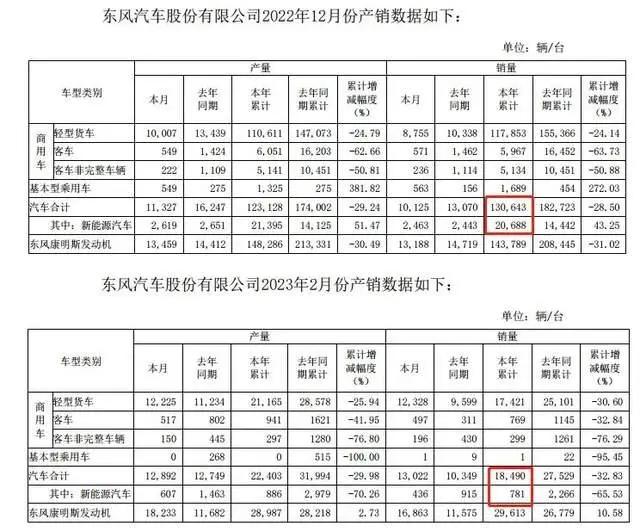 2023年1-2月,东风汽车总销量为18490辆,同期新能源汽车销量为781辆,新能车占比约4.22%。