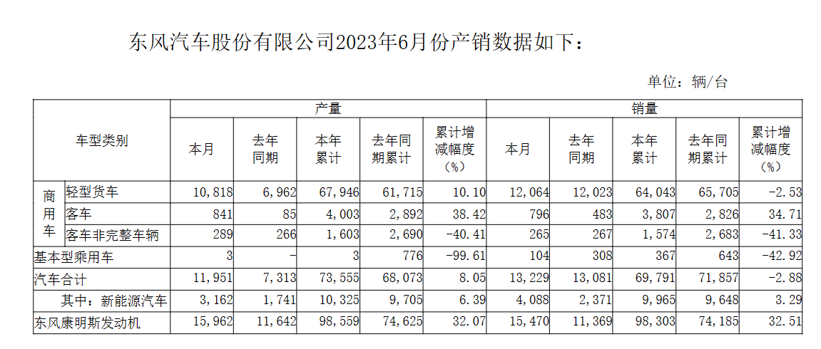 IT之家 7 月 7 日消息,东风汽车股份有限公司于今日公布了 2023 年 6 月的汽车产销数据快报,6 月汽车合计销量 1.32 万辆,其中新能源汽车 4088 辆;本年汽车累计销量 6.98 万辆,同比减少 2.88%。