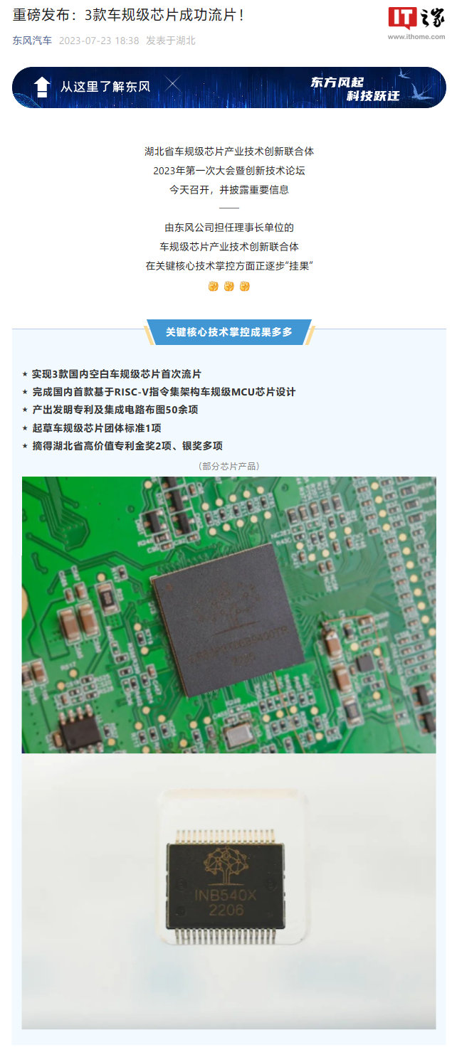 IT之家 7 月 25 日消息,综合东风汽车官方公众号、武汉经开区官方公众号、九派新闻等媒体近期报道,由东风汽车优先公司牵头成立的湖北省车规级芯片产业技术创新联合体成立一年以来,在关键核心技术掌控方面已取得部分成果,目前已实现 3 款车规级芯片首次流片(IT之家注:集成电路领域名词,指“试产”),填补了国内相关行业的空白。