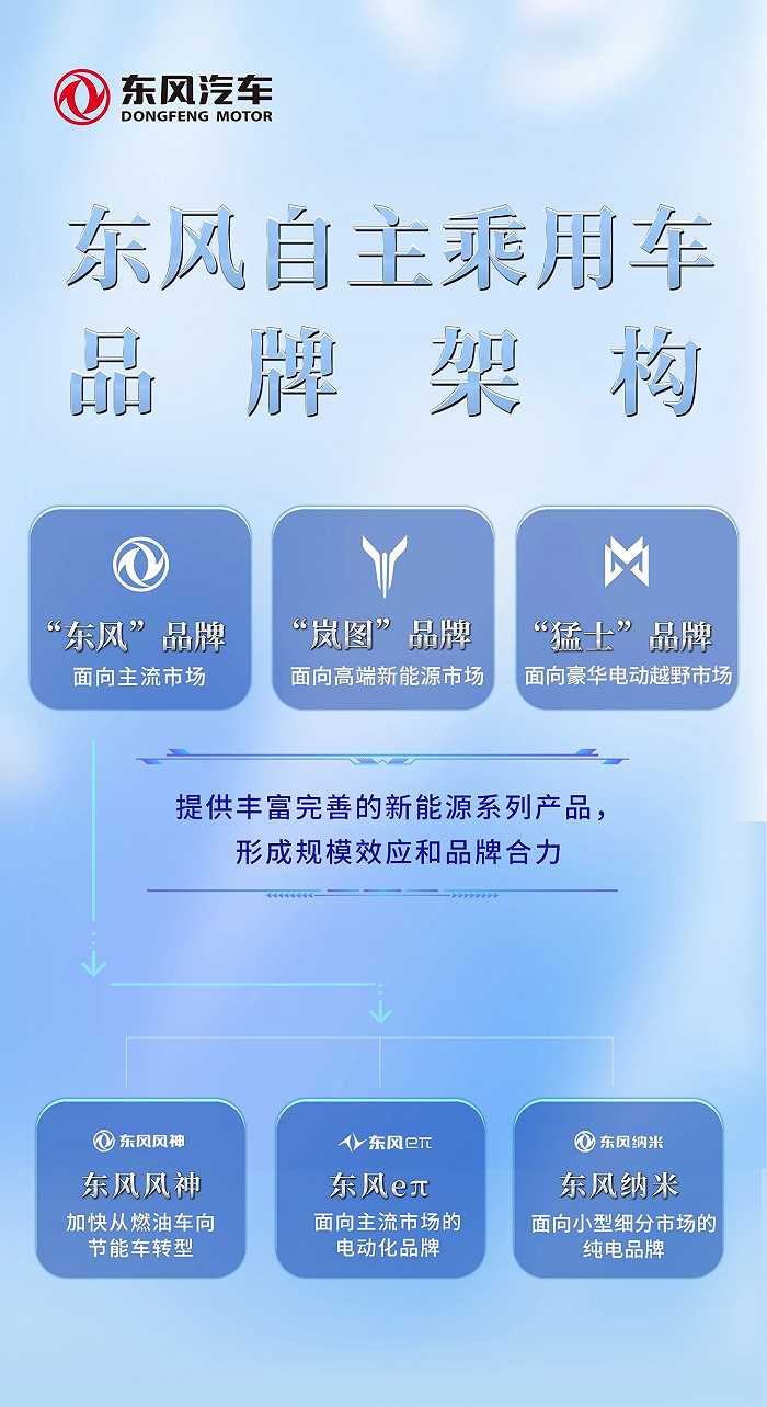 至此,东风集团在乘用车领域形成面向豪华电动越野市场的“猛士”品牌、面向高端新能源市场的“岚图”品牌,以及面向主流市场的“东风”品牌的品牌格局。