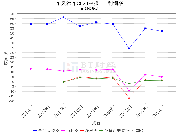 在财务指标方面,东风汽车2023年上半年的毛利率为4.89%,较上年同期的7.25%有所下降。这表明公司的主营业务利润受到一定压力,可能是由于产品结构变化、毛利率降低等因素导致。净利率为1.66%,略低于上年同期的1.71%。这可能也是由于主营业务利润减少所导致。