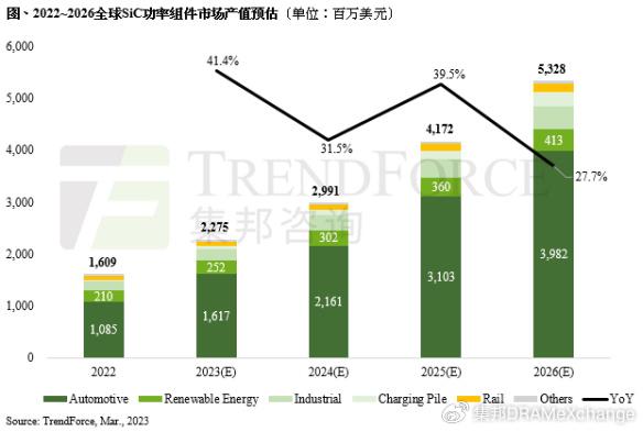 据TrendForce集邦咨询研究统计,随着安森美(onsemi)、英飞凌(Infineon)等与汽车、能源业者合作项目明朗化,将推动2023年整体SiC功率元件市场产值达22.8亿美元,年成长41.4%。至2026年SiC功率元件市场产值可望达53.3亿美元。主流应用仍倚重电动汽车及再生能源,电动汽车产值可达39.8亿美元、CAGR约38%;再生能源达4.1亿美元、CAGR约19%。