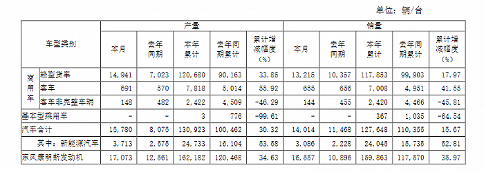 东风汽车11月9日公告,10月汽车销量14014辆,其中新能源汽车销量3086辆。本年累计汽车销量12.76万辆,同比增长15.67%;其中新能源汽车销量2.4万辆,同比增长52.81%。