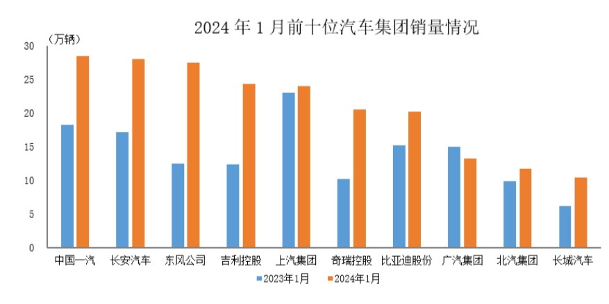2024年1月车企销售情况,中国一汽、长安汽车、东风汽车位列前三