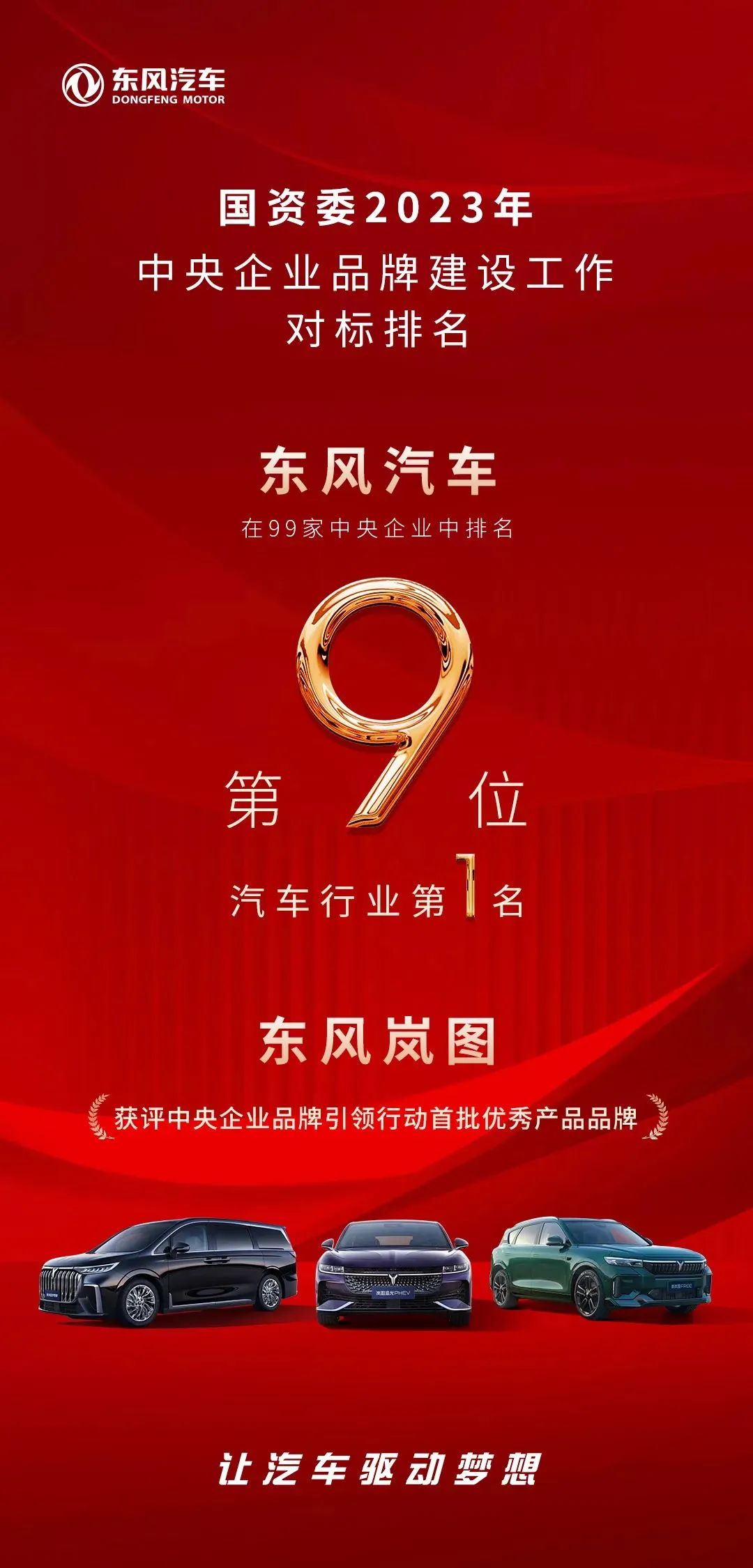 5月11日,国资委发布2023年度中央企业品牌建设对标排名,东风汽车在99家中央企业中排名第9,位列汽车行业第一。与此同时,东风汽车旗下东风岚图获评中央企业品牌引领行动首批优秀产品品牌。