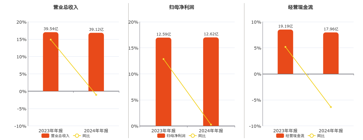 公司营业总收入为39.12亿元,较去年同报告期营业总收入减少4169.39万元,同比较去年同期下降1.05%。归母净利润为12.62亿元。经营活动现金净流入为17.96亿元,较去年同报告期经营活动现金净流入减少1.22亿元,同比较去年同期下降6.38%。