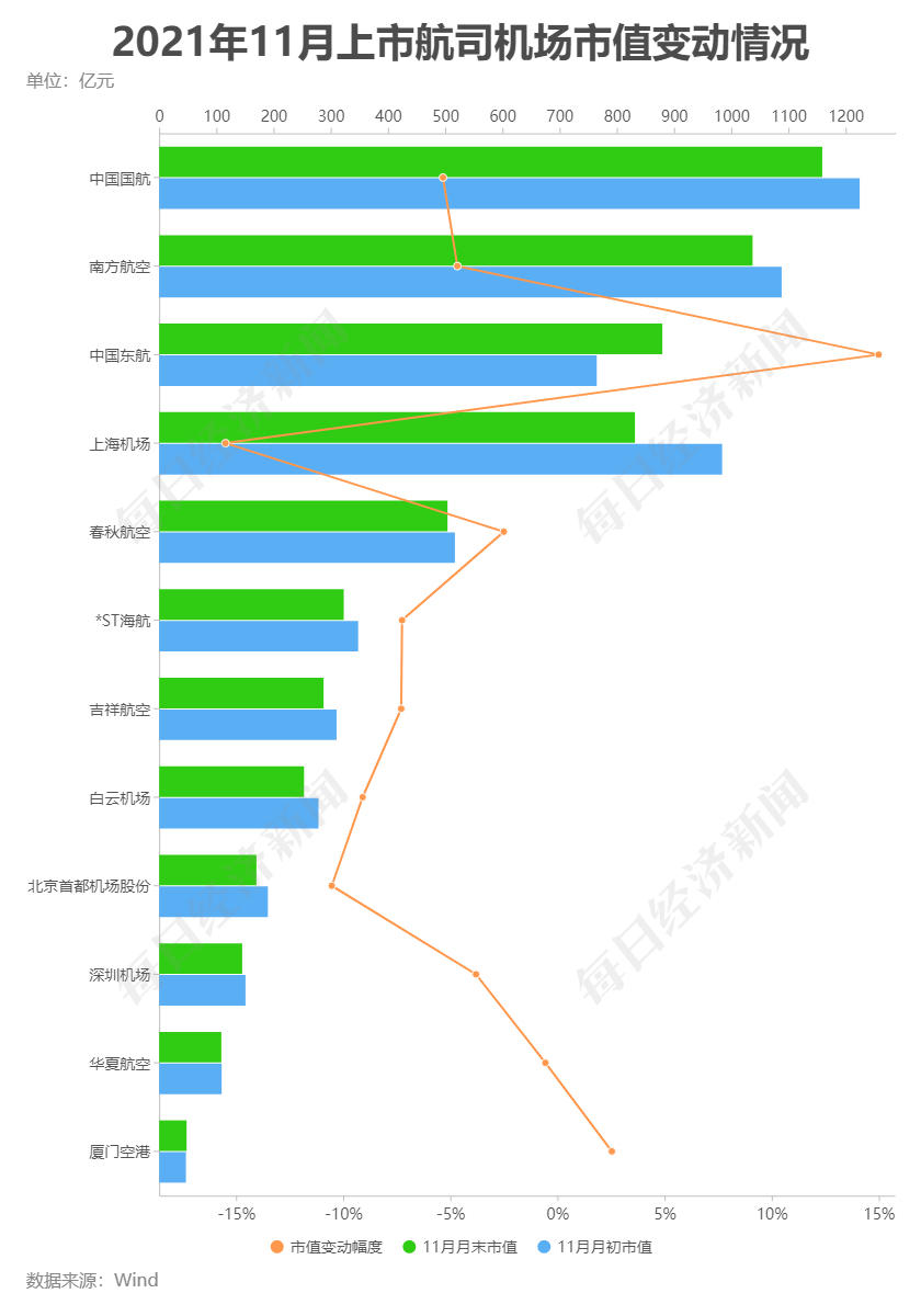 从二级市场来看,民航板块的整体升温趋势在11月画上休止符。消息面上先有进京政策收紧,后有变异毒株来袭,12家上市航司和机场总市值合计蒸发265亿元。其中,上海机场(600009,SH)跌幅最大,但在公布重组草案后迎来触底反弹。