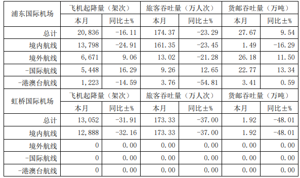 上海机场10月16日公布2022年9月运输生产情况称,9月,浦东国际机场飞机起降量20836架次,同比下滑16.11%;旅客吞吐量174.37万人次,同比下滑23.29%;货邮吞吐量27.67万吨,同比增长9.54%。同时,虹桥国际机场9月飞机起降量13052架次,同比下滑31.91%;旅客吞吐量173.33万人次,同比下滑37%;货邮吞吐量1.92万吨,同比下滑48.01%。