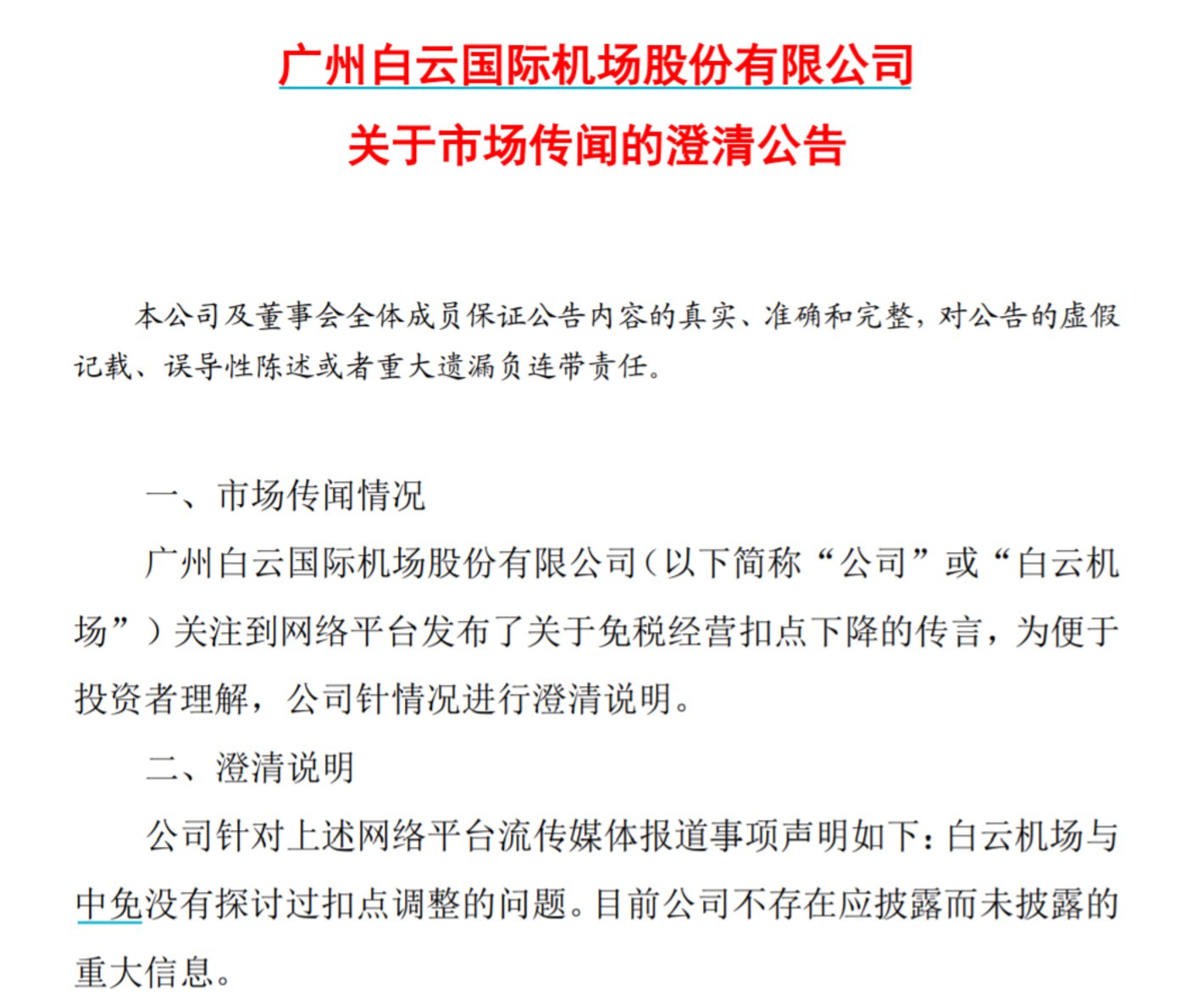 白云机场发布澄清公告称,针对网络平台流传媒体报道事项声明如下:白云机场与中免没有探讨过扣点调整的问题。目前公司不存在应披露而未披露的重大信息。