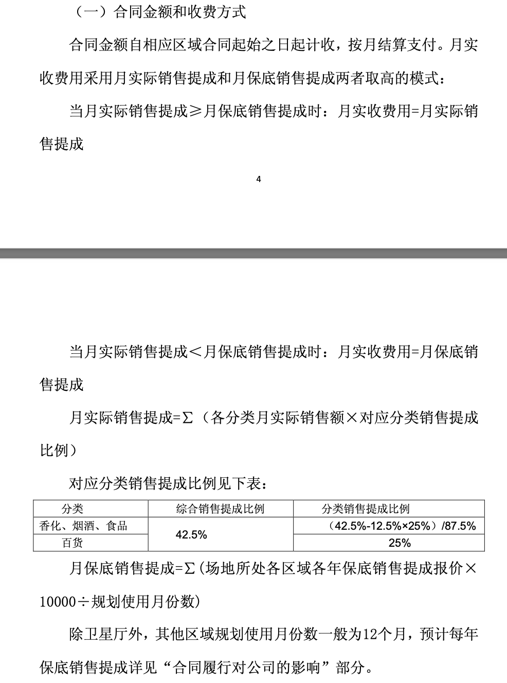 具体来看,当月实际国际客流未超过2019年月均实际国际客流的80%时,月实际销售提成为“人均贡献×月实际国际客流×客流调节系数×面积调节系数”。若当月实际国际客流超过2019年月均实际国际客流的80%,月保底销售提成为“当年保底销售提成÷12个月”。