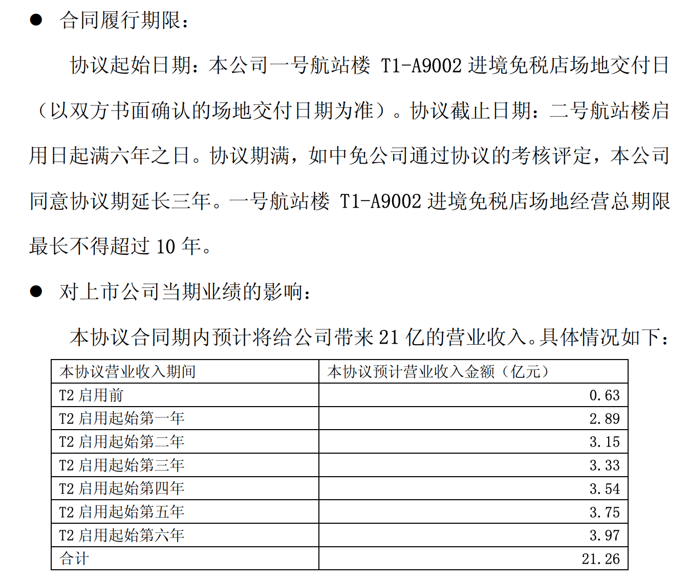 当时预计,该进境免税项目经营合作协议期内将给白云机场带来21.26亿元的营业收入。协议截止日期为T2航站楼启用日(2018年)起满6年,如中免公司通过考核评定,白云机场同意协议期延长三年。