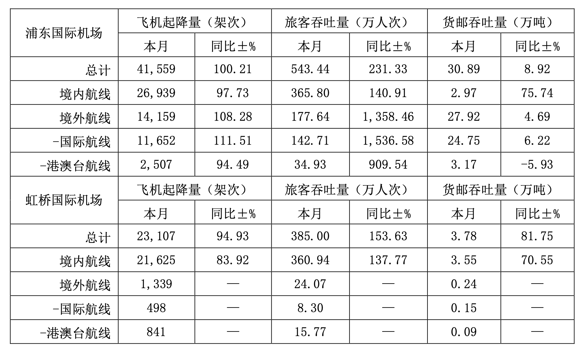 在上述机场旅客吞吐量数据中,浦东国际机场10月境内航线旅客吞吐量同比增长140.91%;境外航线旅客吞吐量同比增长1358.46%,其中国际航线的旅客吞吐量同比增长1536.58%,港澳台航线旅客吞吐量同比增长909.54%。