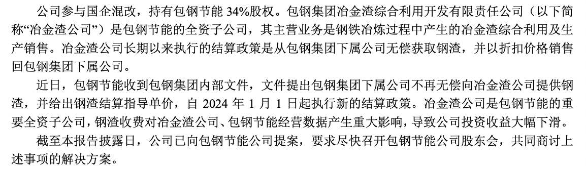 今年4月23日,包钢集团向包钢节能的全资子公司冶金渣公司发布通知,原先免费供应的钢渣,不再无偿供应,并给出了每吨约百元的结算指导价,且于1月1日起执行。钢渣价格的变化很快就遭到了2022年混改时入股包钢节能的中航泰达以及中国五矿旗下的五矿金通股权投资基金管理有限公司(简称五矿金通)的反对。认为包钢集团和包钢股份等涉嫌违反混改时的约定,且此次调价在未经外部股东同意的情况下调整包钢股份供应给包钢节能的钢渣结算价格,涉嫌违反了混改公司的企业章程。