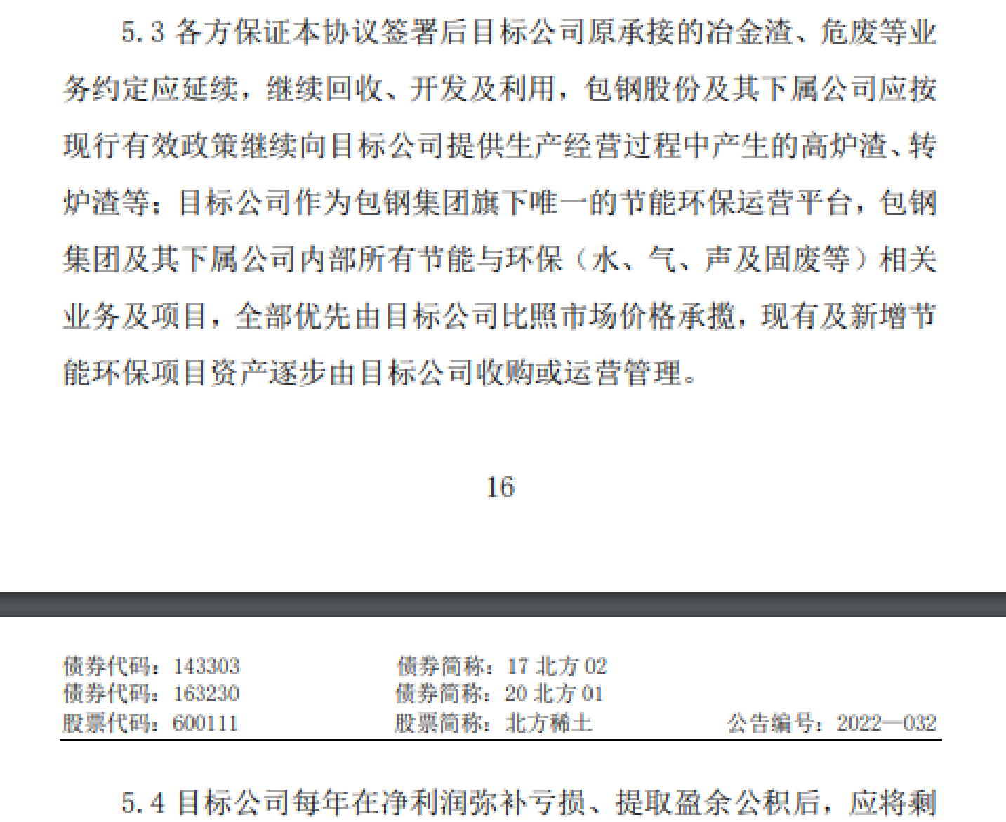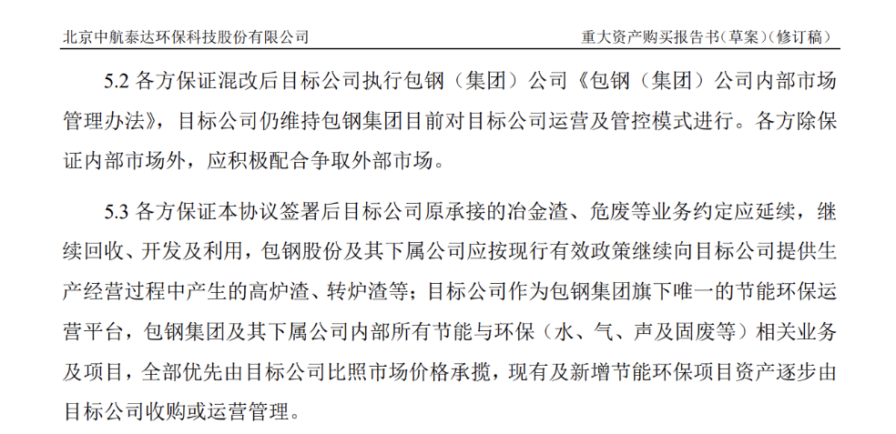 包钢节能及其各方股东此前共同签署的《增资扩股及股权转让协议》第五条第三款约定:“各方保证本协议签署后目标公司原承接的冶金渣、危废等业务约定应延续,继续回收、开发及利用,包钢股份及其下属公司应按现行有效政策继续向目标公司提供生产经营过程中产生的高炉渣、转炉渣等。”