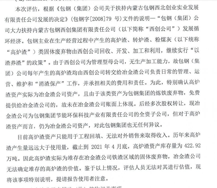 在内蒙古产权交易中心包钢节能混改挂牌中,公示了包钢节能的评估文件,即《包钢集团节能环保科技产业有限公司拟进行混合所有制改革所涉及的股东全部权益价值资产评估报告》天兴评报字【2021】第 1182(号)。该报告摘要七、评估结论(五)提到:“本次评估,根据《包钢(集团)公司关于扶持内蒙古包钢西北创业实业发展有限公司发展的决定》……包钢业主在生产经营过程中产生的高炉渣、转炉渣、粉煤灰(统称“高炉渣”)类固体废弃物由西创公司回收、开发、加工和利用,继续实行“以渣养渣”的政策。由于西创公司为管理型母公司,无生产加工能力,故包钢(集团)每年产生的高炉渣均由西创公司转交给冶金渣公司负责日常的管理、运营、维护和“消渣保产”工作,并承担相关的费用和责任。为此,特别确认高炉渣资产实际为冶金渣公司资产,且由于该类资产为包钢集团的炼铁废弃物,免费提供给冶金渣公司的,故未在冶金渣公司账面体现。后经多次股权转让,现冶金渣公司为包钢集团节能环保科技产业有限责任公司的全资子公司,但对于高炉渣资产而言,仍为冶金渣公司资产,对此包钢集团也无任何异议。”