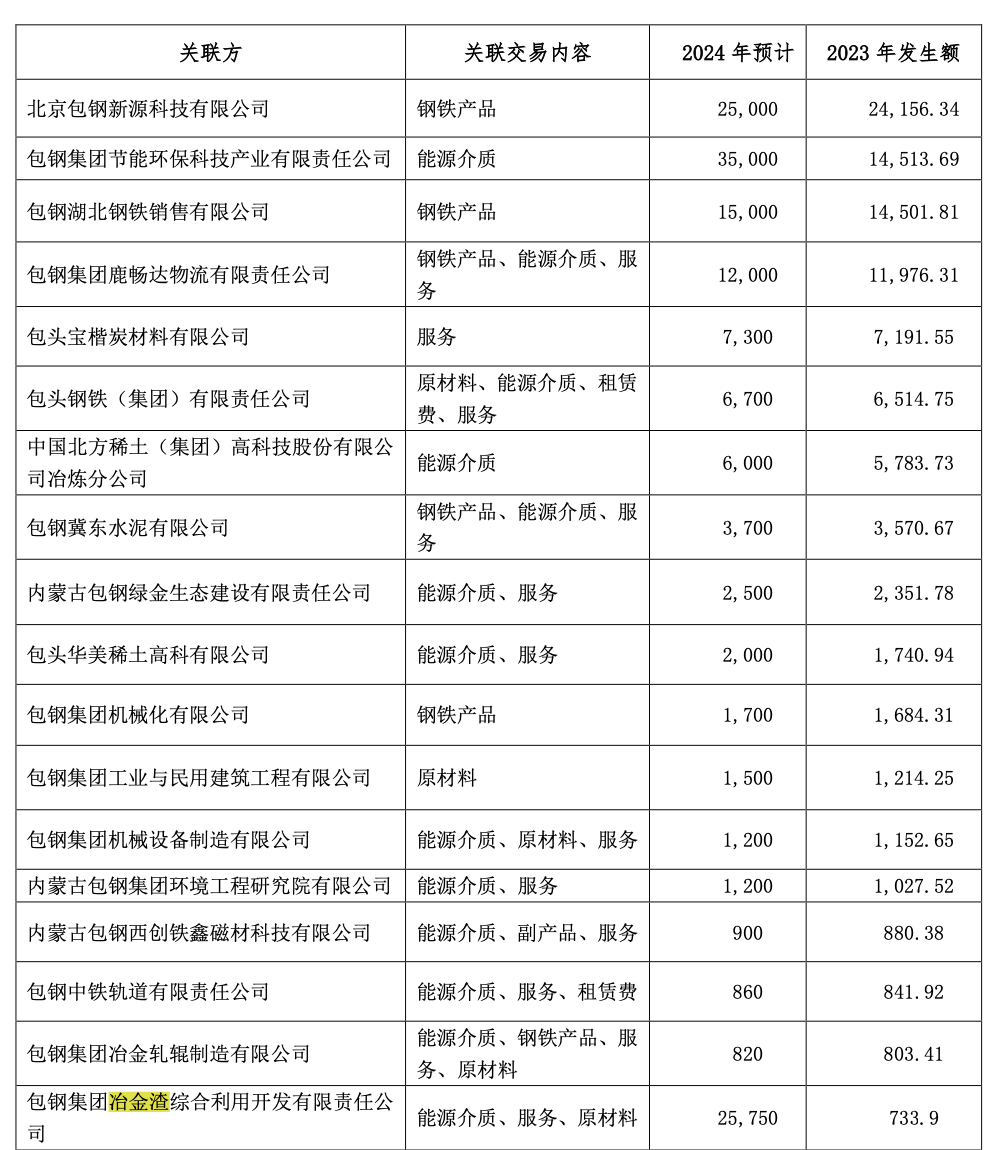时代周报记者注意到,2022年、2023年,包钢股份对冶金渣公司的关联销售内容为能源介质、服务、原材料,关联销售实际金额分别为701.32万元、733.90万元。然而,根据“关于2023年度关联交易执行情况及2024年度日常关联交易预测”的公告,2024年预计关联销售金额突然暴增至2.58亿元。