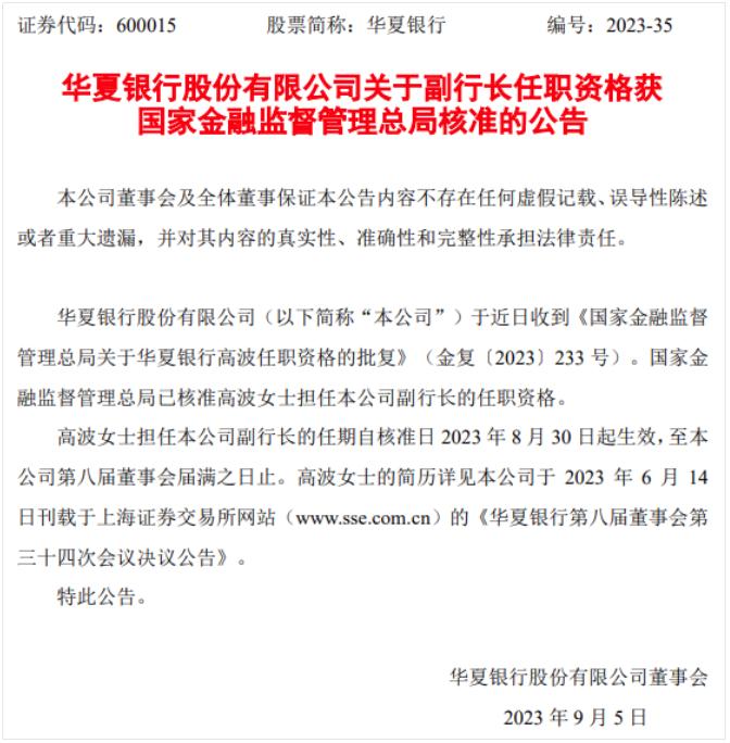 9月4日,华夏银行发布公告称,其已经收到国家金融监督管理总局相关批复,高波任该行副行长的任职资格获批,其任期自2023年8月30日起,至该行第八届董事会届满之日止。