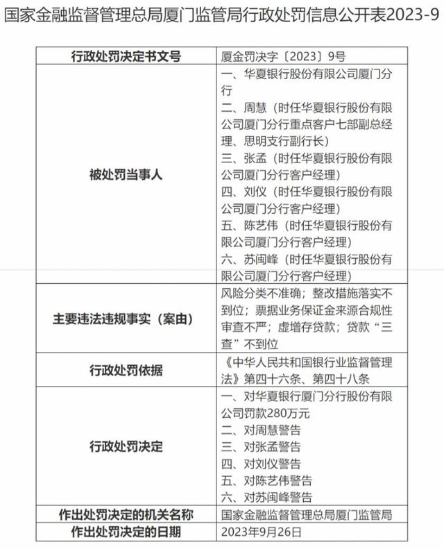 据国家金融监督管理总局官网信息,华夏银行厦门分行9月26日被国家金融监督管理总局厦门监管局罚款280万元,主要因风险分类不准确、虚增存贷款等。
