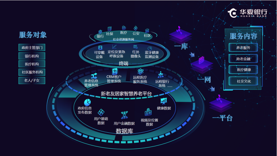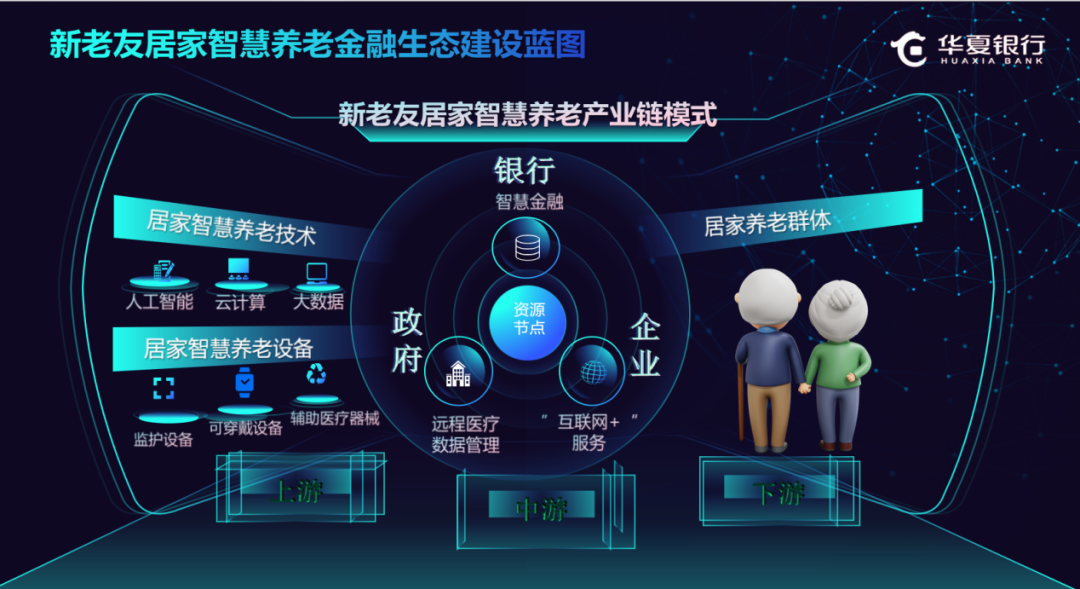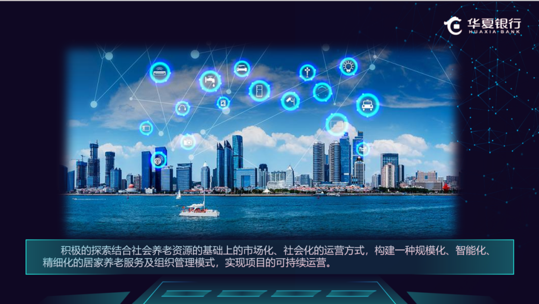 华夏银行正在构建居家智慧养老金融新生态,利用物联网、云计算、大数据、智能硬件等新一代信息技术,建立基于信息化、智能化社会管理与服务的养老服务体系,涵盖老年人的金融、安全保障、健康管理等方面,对涉老信息自动检测、预警甚至主动处置,实现与老年人友好、自主、个性化智能交互,实现个人、家庭、社区、机构与健康养老资源的有效对接和优化配置,推动健康养老服务智慧化升级,提升健康养老服务质量效率水平。