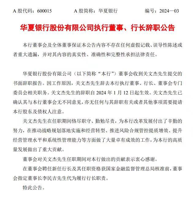 1月12日,华夏银行股份有限公司发布公告,董事会收到关文杰先生提交的书面辞职报告。因工作原因,关文杰辞去华夏银行执行董事、行长、董事会专门委员会相关职务。