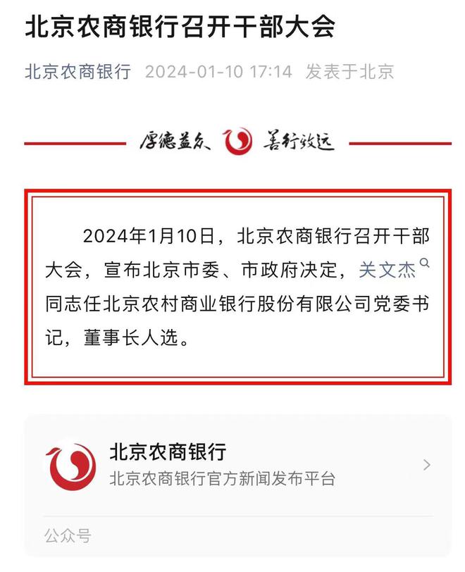 2024年1月10日,北京农商银行在微信公众号宣布,北京市委、市政府决定,关文杰同志任北京农村商业银行股份有限公司党委书记,董事长人选。
