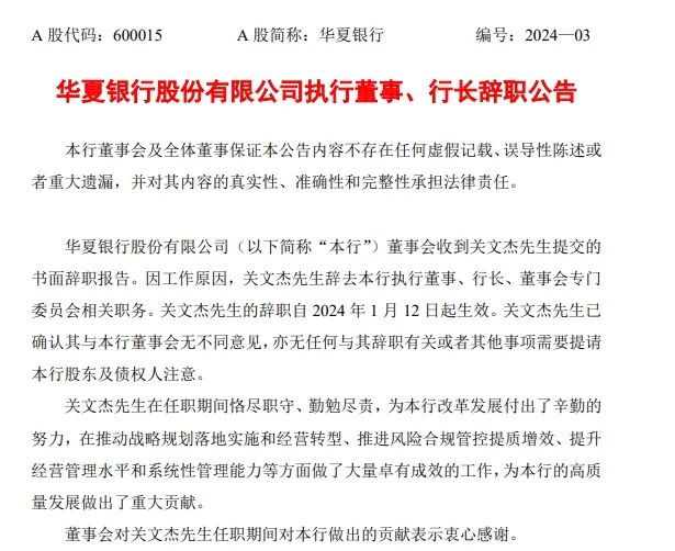 1月13日,据华夏银行公告,董事会收到关文杰提交的书面辞职报告。因工作原因,关文杰辞去本行执行董事、行长、董事会专门委员会相关职务,关文杰的辞职自2024年1月12日起生效。