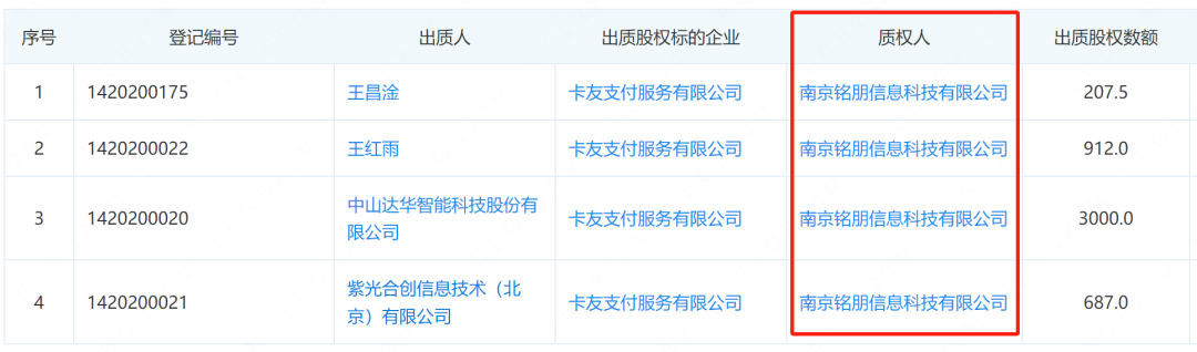 根据企查查显示,卡友支付的第一股东达华智能持股比例30%,第4股东王某雨持股比例9.1200%,第7股东紫光合创持股比例6.87%,第八股东王某淦持股比例2.0750%,四位股东的所有股权全部质押给南京铭朋信息科技有限公司,显然这不符合新规的第四十一条。