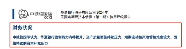 由此可见,华夏银行面临着资本补充的压力。评级机构中成信国际对华夏银行发行债券的评级报告中也指出,华夏银行盈利能力有待提升,资产质量面临持续压力,短期流动性风险管控难度较大,面临持续的资本补充压力。