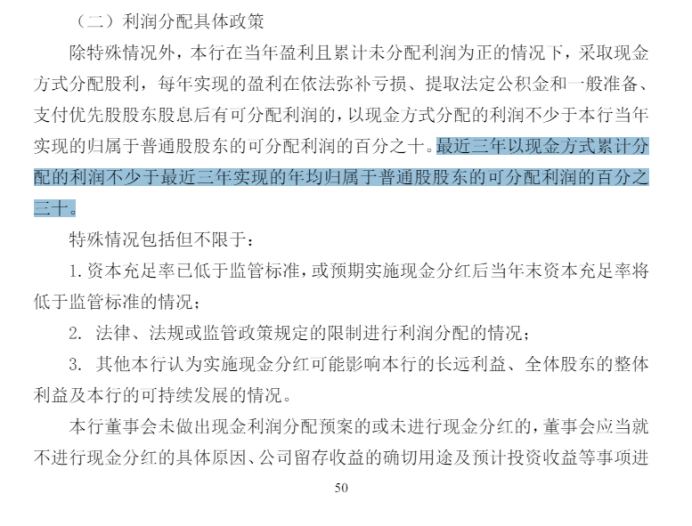 而根据华夏银行近几年来的《公司章程》都规定:“最近三年以现金方式累计分配的利润不少于最近三年实现的年均归属于普通股股东的可分配利润的百分之三十。”至于《公司章程》所说的排除情形,作者查了下近几年均不存在。